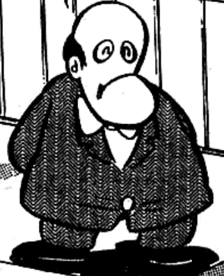 Alphonse is a squat fat man with a bean shaped head. He has a small moustache and a bald head.