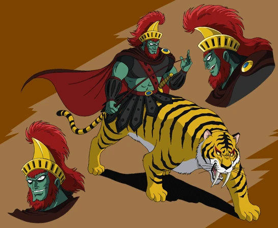 Archduke Gorgon has a green skinned human-like torso with red hair clothed in black armor and a cape attached to the lower back of a sabretoothed tiger.