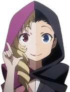 Ashura is a young woman with a very unusual appearance. The right side of her body resembles a woman with blonde hair, a red eye, lipstick and light skin wearing a pink dress and a white shoe. This side also wears more feminine gear such as adult panties and an adult bikini. The left side of her body somewhat resembles a man with short black hair, a blue eye (later revealed to be a contact lens), darker skin (make-up), and a slightly smaller breast while wearing a dark business suit and a black shoe. This side also wears masculine gear such as boxer shorts or a full body swimsuit. She wears a hooded cloak that is black on the left side and bright pink on the right side. One of her costumes in Robot Girls Z ONLINE include a wedding dress and tuxedo called Baron Ashura Bridal which was used for Golden Week.