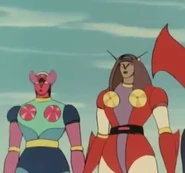 Diana A is given a frame more similar to Mazinger Z and Minerva X, featuring a more humanoid face colored pink with a light purple crown. Her torso is colored different shades of blue while her joints are colored yellow. On her chests are a pair of light pink tipped missiles.