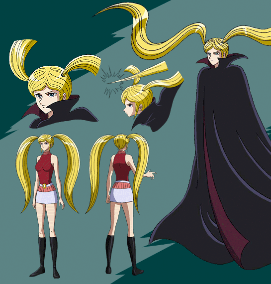 The Gamia Q resemble tall young attractive women with blonde hair worn in pigtails and have blue eyes. Their outfits consist of a red sleeveless sweater, with white skirts, belts, and boots. Later they dress up in black cloaks with nothing underneath. Without their clothing, they are shown to have mechanical joints.