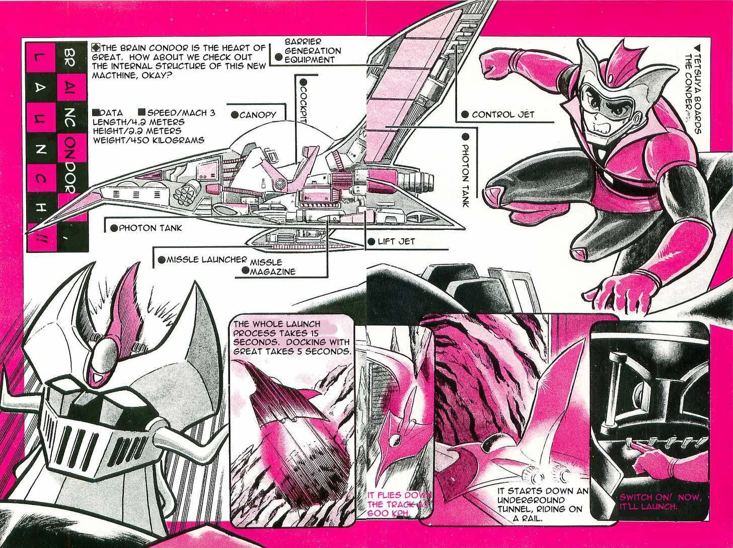 The Brain Condor (ブレーンコンドル) is a jetcraft that serves as the control center for Great Mazinger, docking on Mazinger's head port to activate it. The jetcraft utilizes a pair of jet engines on the rear for thrust, along with another pair below the wings for deceleration, all of which are usable underwater. In order to incorporate piloting functions for both a jetcraft and a giant robot, the cockpit control system is designed to be both simple and multifunctional, allowing the pilot to effectively control Great Mazinger through minimum action. Normally stored within the Science Fortress Laboratory's lower hanger, the Brain Condor travels within an underwater pipe at 600 km/h when deployed, before entering a solutional cave tunnel, emerging on the other side, passing through a wrecked ship, and taking to the skies, with the entire launching process taking only 15 seconds. The cockpit rotates 90 degrees after docking.