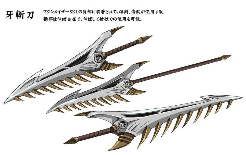 - Ganzanto: A gigantic shark-toothed sword attached to the back. It features two sides, one with a razor sharp blade; and another with spikes that can rip enemies apart. The handle can extend so that it can be used as a pole-arm. This weapon is used when Kaido controls Kaiser. It can also be used for a combo attack with the Tornado Crusher Punch. It's name literally means 'Fang Slashing Sword'.