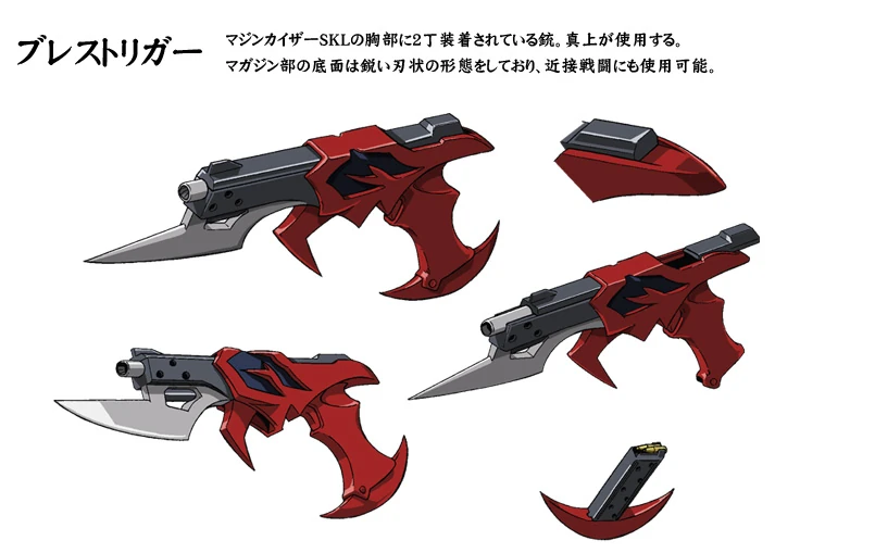 - Breast Trigger: A pair of hand-guns attached to the chest that Kaiser uses to shoot enemies at mid-range whenever Magami is in control. Magazines come from the arms of the Kaiser to put into the Breast Triggers. For close combat, the guns each have bayonets under the barrels, and the underside of the magazines are sharpened blades, which Kaiser can use as hand axes for close combat by gripping the barrels. The guns can also be combined into a battle ax with a long handle. When in full power, the Breast Triggers can shoot lasers instead of bullets.