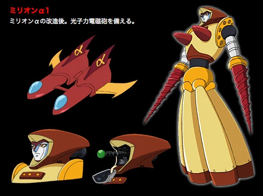 Compared to its original version, Million Alpha 1 is much larger and features different armaments. The lances on its arms are now drill shaped, it features long thrusters on the bottom half of its body. The head is also shaped differently, the helmet becoming longer. Its Pilder comes in through the back and the twin cockpits are located on the chest. It also has a different color scheme, primarily featuring a yellow body and a red paintjob on the outer pieces.