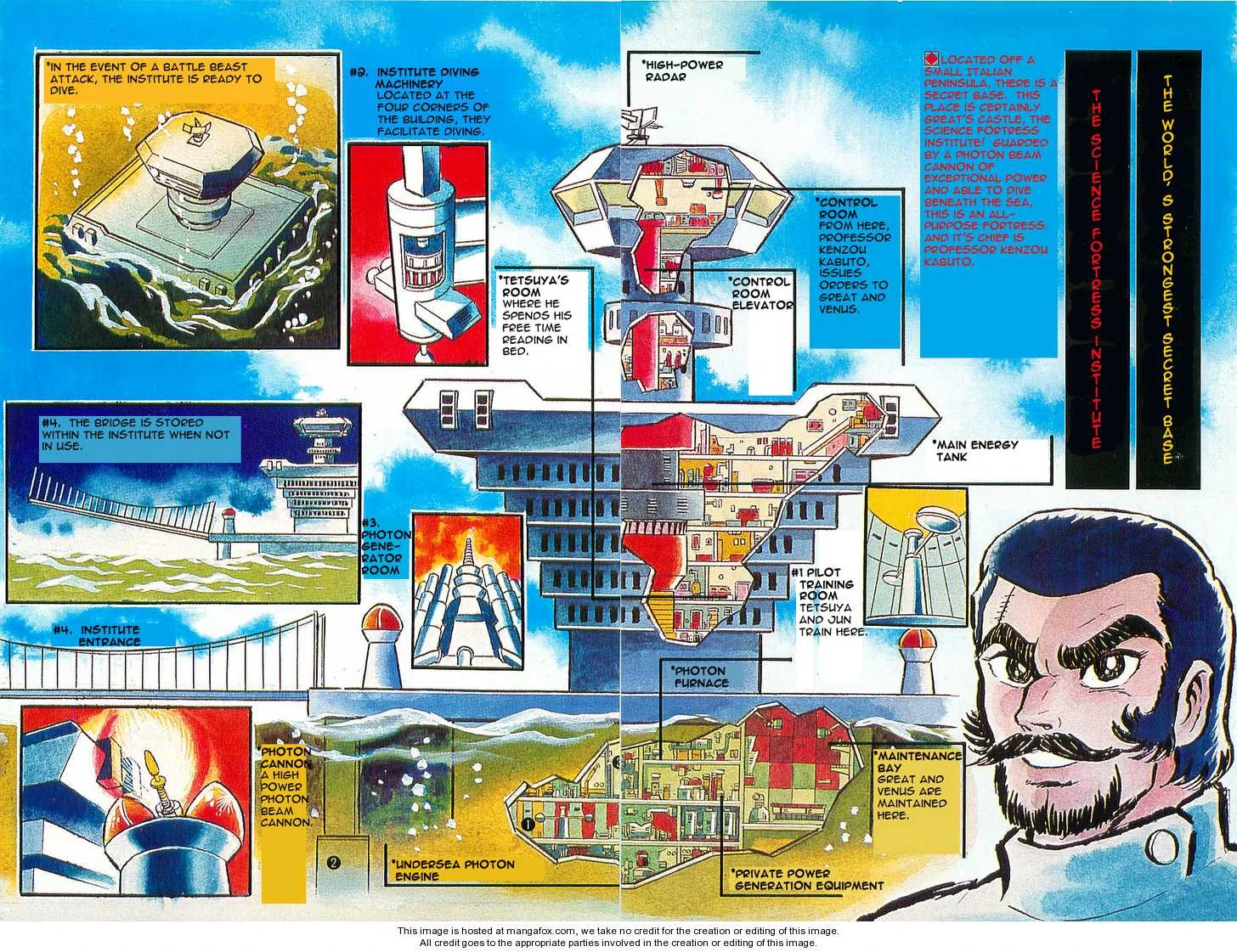 The Science Fortress Laboratory is the main headquarters of Kenzo Kabuto, who decided to stay hidden for a very long time. Unlike the Photon Power Laboratory, which was made for research; Kenzo built this fortress to prepare pilots, robots, and weapons for the battle against the Mycenae Empire. It was here he created the Great Mazinger.